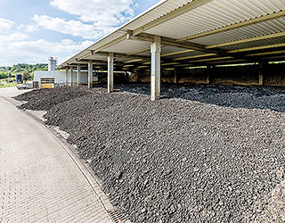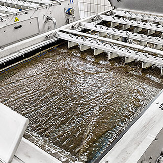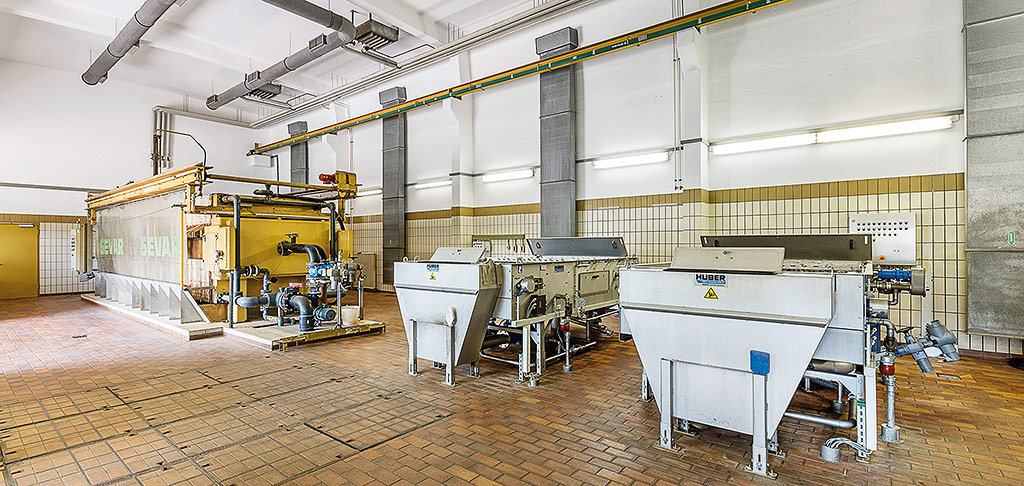 Der in der Kammerfilterpresse entwässerte Schlamm wird beim Öffnen der Presse in den Schlammbunker abgeworfen, von dort über einen Trogketten- und Steilförderer zur Schlammlagerhalle gefördert. Dort wird er bis zur endgültigen Verwertung zwischengelagert. Das abgetrennte Wasser (Filtrat) wird wegen seiner relativ hohen Belastung wieder der Abwasserreinigung zugegeben.