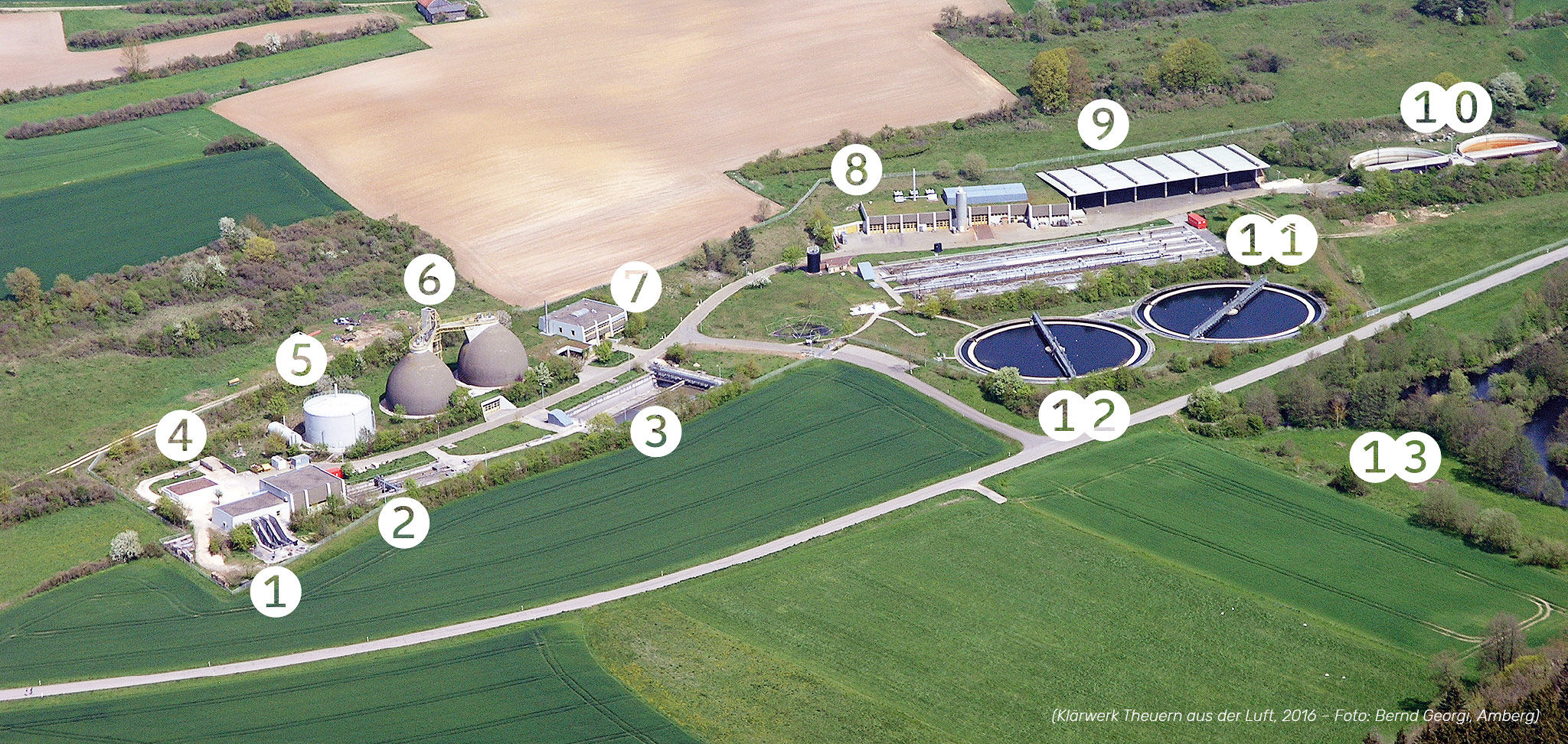 ①Einlauf, Schneckenhebewerk ②Sand- und Fettfang ③Vorklärbecken ④Rechengebäude ⑤Gasbehälter ⑥Faultürme ⑦Betriebsgebäude ⑧Maschinenhaus mit Blockheizkraftwerken, Werkstätten, Kammerfilterpresse ⑨Klärschlammzwischenlager ①⓪Faulschlamm- und Filtratwasserspeicher ①①Belebungsbecken ①②Nachklärbecken ①③Schönungsteich