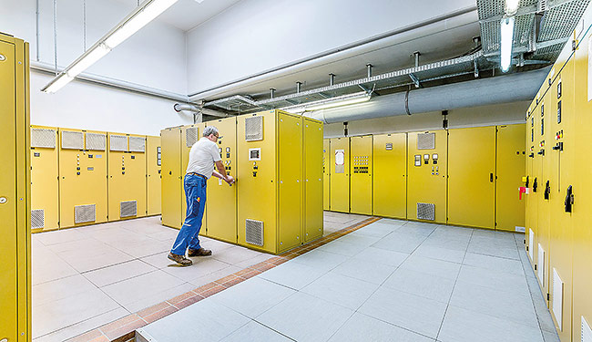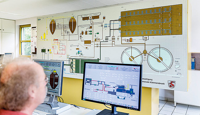 Die Steuerung der Antriebsaggregate der einzelnen Verfahrensstufen erfolgt von dezentralen autonomen Unterverteilungen, die mit speicherprogrammierbaren Steuerungen (SPS) ausgerüstet sind. Die von den SPS aufgenommenen Prozessdaten werden zur zentralen Schaltwarte im Betriebsgebäude weitergeleitet. Dort werden die Daten von der EDV-Anlage erfasst und aufbereitet.